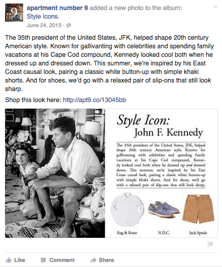 As manager of e-commerce and lead copywriter at Chicago-based menswear shop, Apartment Number 9, I managed all aspects of the webpage, and I produced all written content displayed throughout the site. From product copy to brand descriptions and promotional materials to headlines, each and every word was written by me. Additionally, I managed and developed content for our social media pages, and also I contributed to our online magazine called The Bulletin. Scroll down to see what I made.