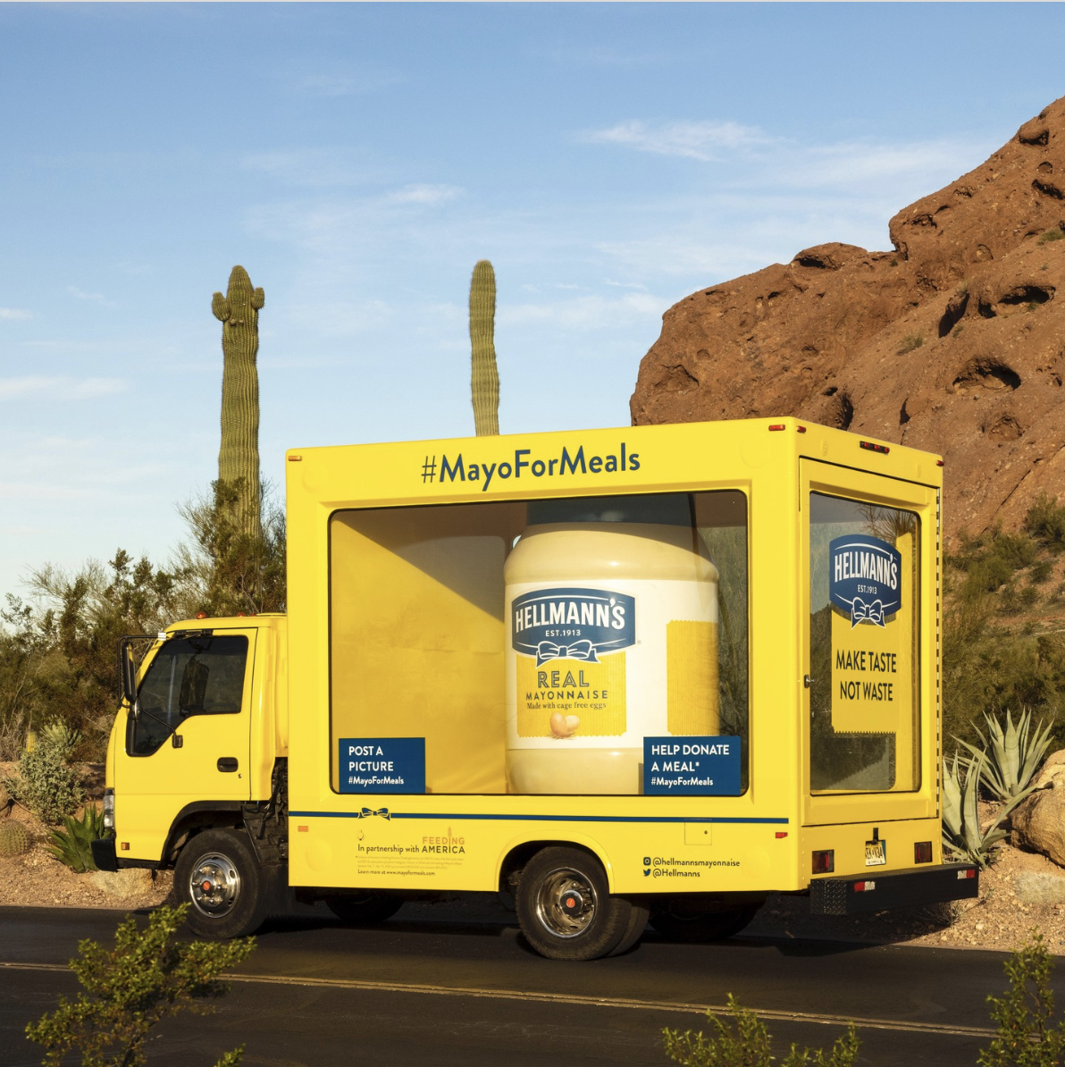 The Super Bowl is one of the biggest food waste days in America, so this year, Hellmann’s set out to make taste, not waste by sending their giant Hellmann’s jar on a roadtrip from the big game to HQ, donating meals for every mile traveled (and every photo shared with our hashtag!) on social media. Extending the big game commercial ingredients of Brie Larsen (cheese) and John Hamm (ham), we made stops in St. Louis, the birth place of John Hamm, and at The Cheese Castle in Wisconsin.