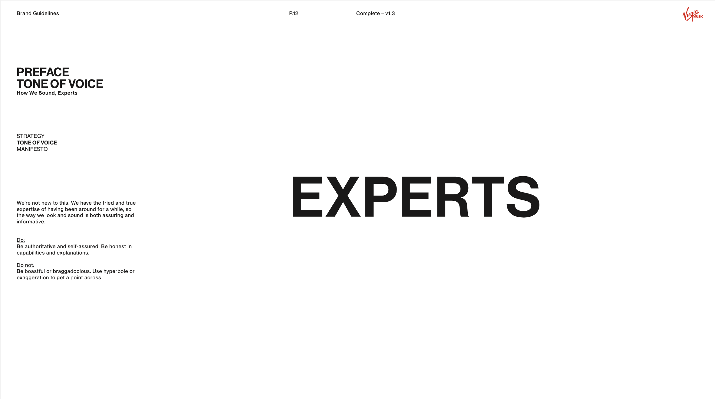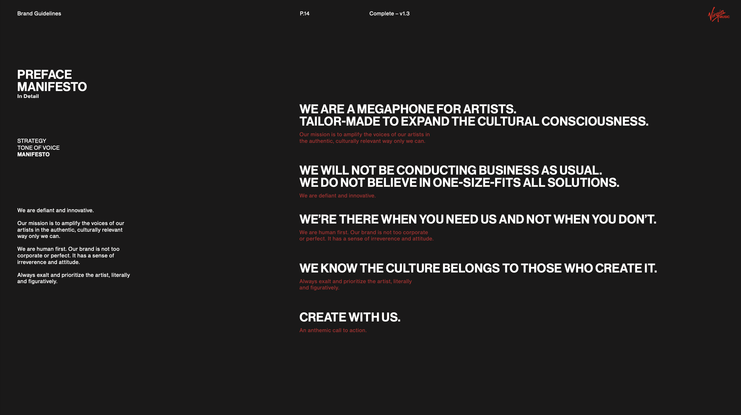 I was brought on by Works Studios to write the strategic direction and copy for the rebrand of Virgin Music. After developing the brand strategy, I wrote the new tone of voice and brand guidelines, plus copy got the website with the team of designers. Below you’ll find a selection of pages from the brand guidelines.